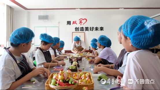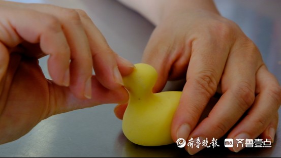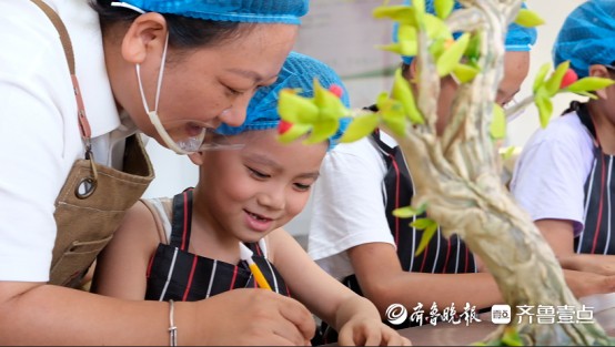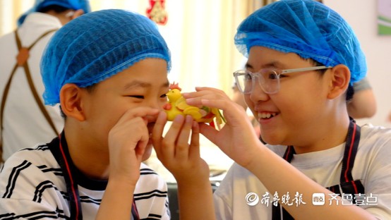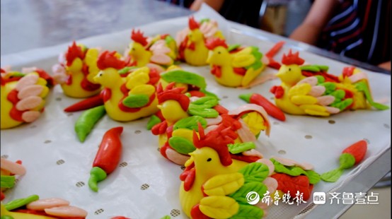 在面点师傅的悉心,小朋友们揉面、捏花、发酵、蒸制,在将枣庄特色辣子鸡制成的馅料裹进面团中,揉捏出小鸡的造型,再贴上五彩面片羽毛,憨态可掬的辣子鸡花馍已雏形初现。
