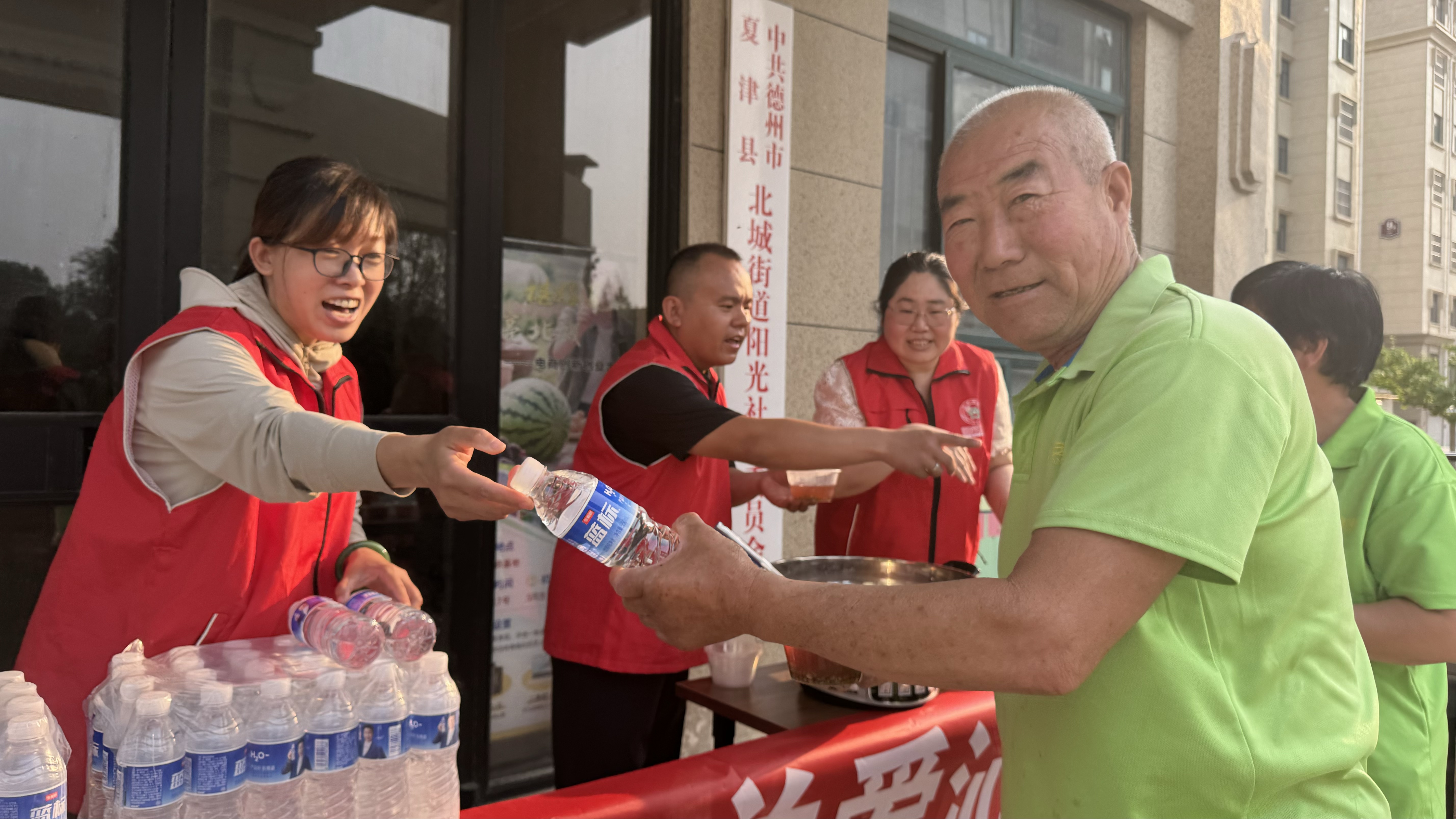 走进夏津县德百商圈的爱心商铺志愿服务站点里,志愿者们正为外卖骑手、快递员、环卫工人等户外劳动者递上绿豆汤、冰镇矿泉水、风油精,还细心地帮他们擦拭汗湿的镜片。 “歇个脚的空,眼镜就帮忙免费给清洗了!”在这里刚喝完绿豆汤的外卖小哥李宁戴上焕然一新的眼镜,高兴地说:“干净又清爽,接单都更有劲儿了!” 这暖心一幕,源于夏津县组织实施的“为户外劳动者送清凉”志愿服务行动。自今年5月起,夏津县委社会工作部发挥志愿服务牵头抓总作用,联合县总工会、市场监管局等11家部门单位和街道发起行动,50余家爱心商户积极响应号召,通过49处志愿服务站点、18个流动“清凉小分队”、108场主题志愿活动,为2000余名户外劳动者提供喝水、休息、就餐等“一揽子”暖心服务。