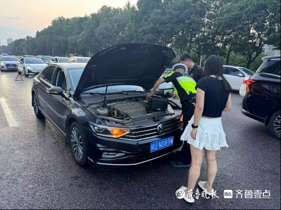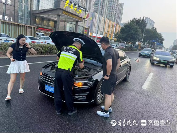 临沂路中队作为日照高新区派驻单位,在夏季旅游旺季期间,承担着辖区日常交通管理重任,同时肩负旅游景区周边安保支援使命。海曲路与青岛路路口,是游客下高速进入万平口景区的必经之地,也是分流景区车辆的核心节点。“向北分流至万平口换乘中心,游客可停车后换乘公交直达景区。”中队长厉均峰的话,道出了这个路口的关键作用。临沂路中队常年负责海曲路与青岛路路口,自夏季旅游旺季开启,中队21名警力便开启了“连轴转”模式:每天清晨7点,朝阳刚染亮海面,他们已准时到岗;深夜11点,最后一批游客伴着星光离去,巡逻车灯才缓缓淡出夜色。3名民警带领18名辅警轮值夜班,周末更是全员上阵,用脚步丈量责任,用汗水守护畅通。 执勤中,他们不仅是交通秩序的“指挥官”,更是游客的“贴心人”。7月13日中午,海曲路与青岛路交叉路口西侧,一辆西安牌照的轿车突然在路中央熄火,司机急得满头大汗。正在执勤的辅警时文乾见状,立刻上前安抚,转身从附近洗车店借来临时电源,熟练地为车辆搭电。当引擎重新启动,司机紧紧握住时文乾被汗水浸透的手,连声道:“谢谢你们,日照交警真是好样的!”