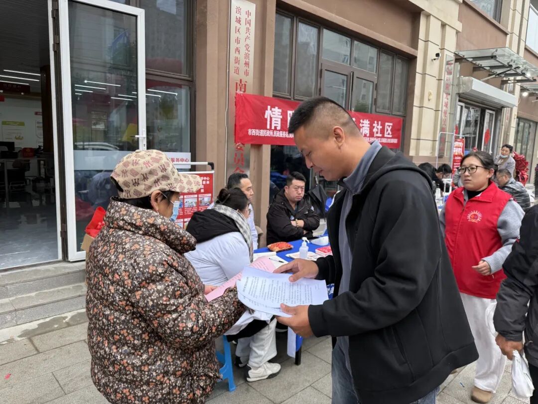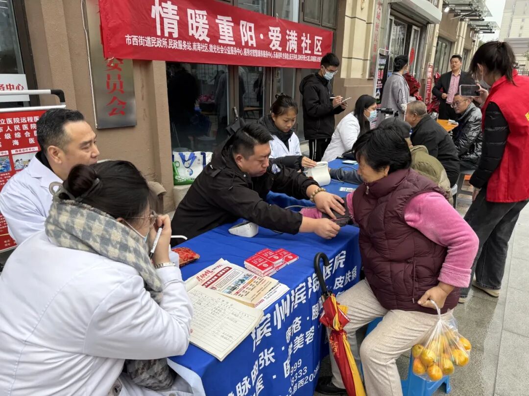 重阳将至,为弘扬尊老敬老传统美德,10月26日上午,滨城区市西街道南海社区联合民政所、老干办、社区卫生服务中心、幸居超市、鑫城海物业、农商银行双湖支行等多家单位,在南海社区党群服务中心开展“九九重阳暖桑榆 同心同行筑温情”志愿服务活动,用贴心服务为辖区居民送上一份特殊的节日祝福。